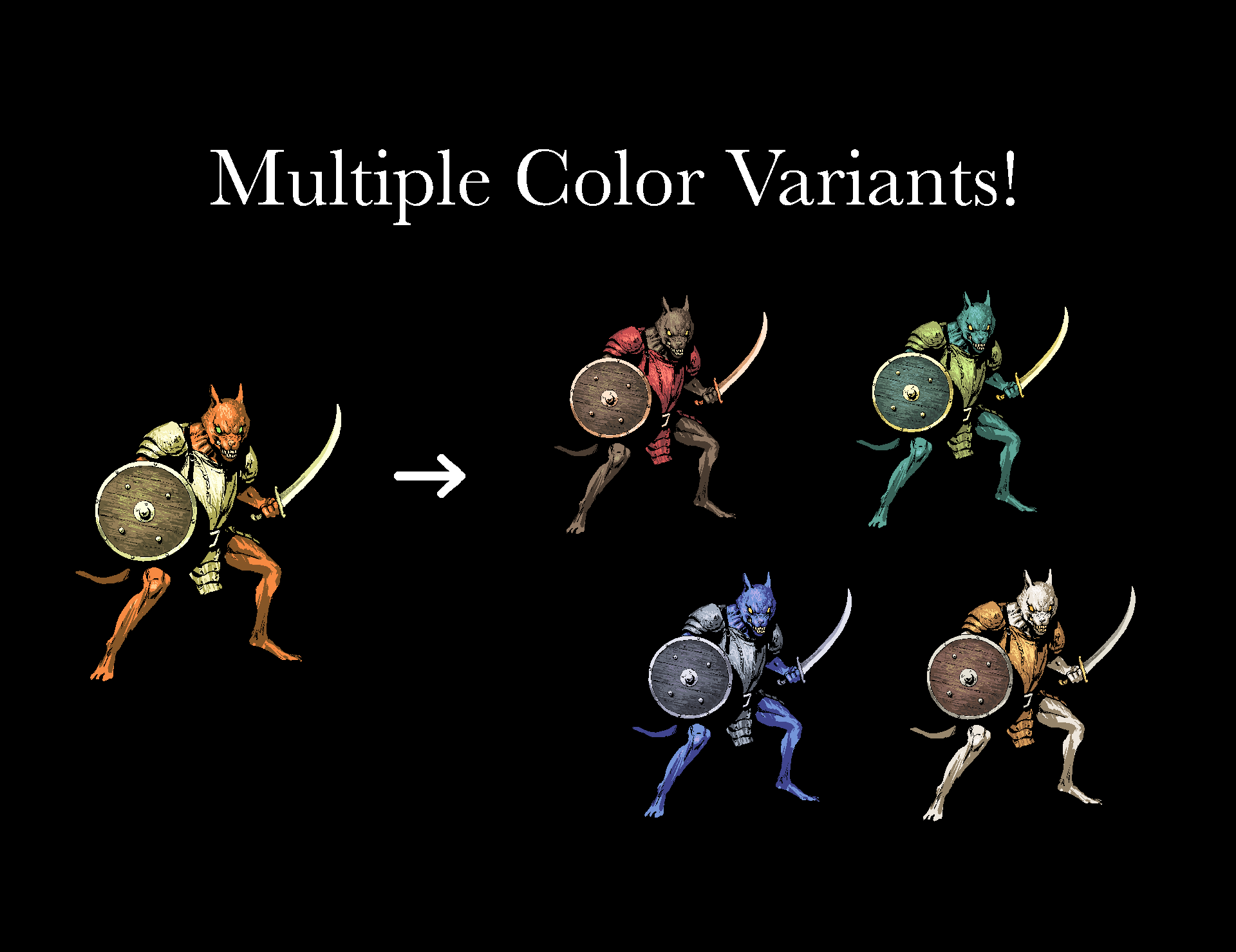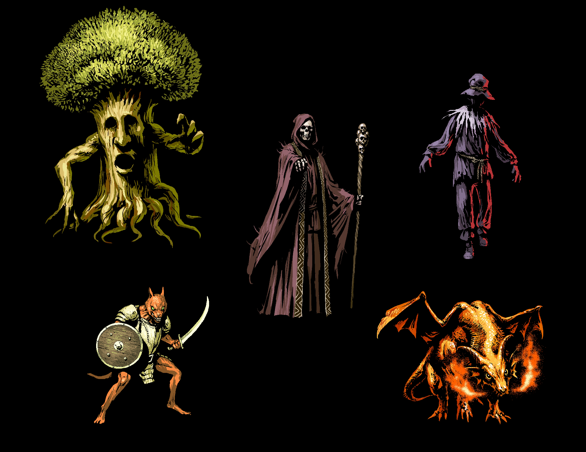 Kobold, Treant, Scarecrow, Dragon, Bone Wizard. + Color variants. Try a sample below!